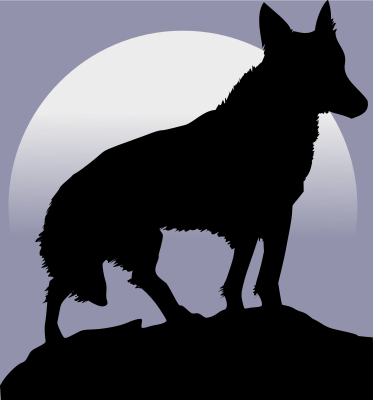 A wolf silhouette in front of the moon.
