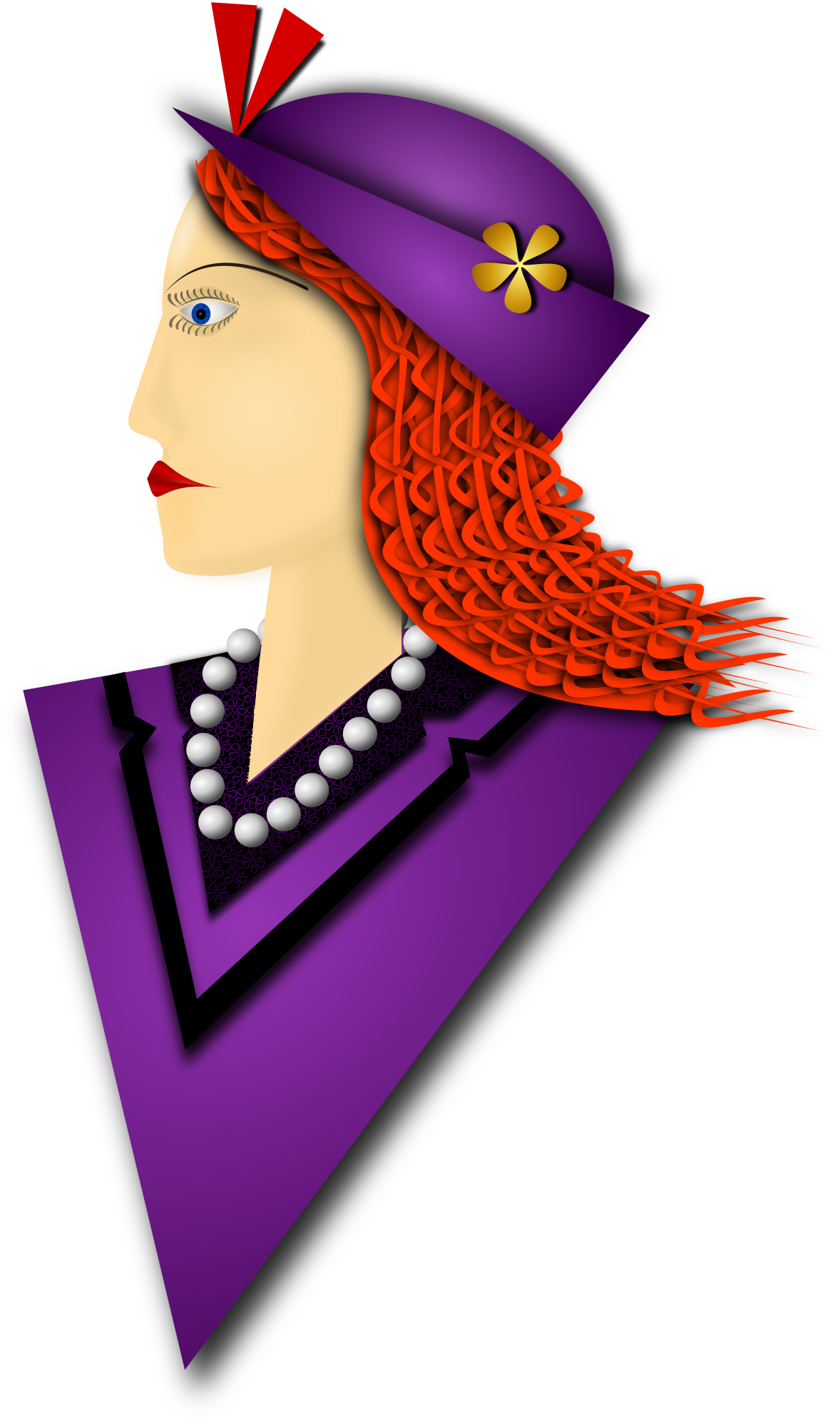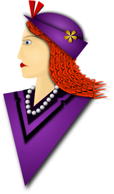 A remix of the drawing I made of an Elegant Lady. The coat and hat are Purple, braided hair, fashionable hat, pearl necklace, flowery detail on shirt collar. Drawn with Inkscape.