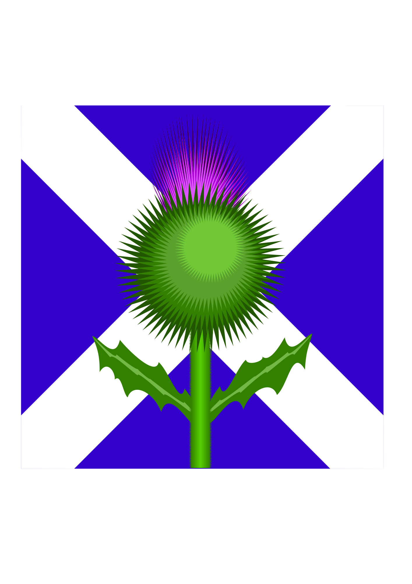 The two national emblems: the flower of Scotland: the thistle in front of the national flag: St Andrews cross