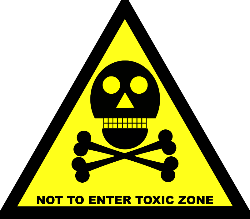 A triangular yellow warning sign with crossbones and a text warning that one should not enter the 'toxic zone'.