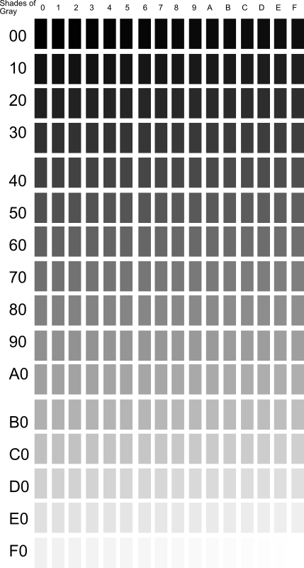 (More than 50) Shades of Gray (all 3 colors having the same value) from 0 (black) to 127 (gray), to 255 (white).