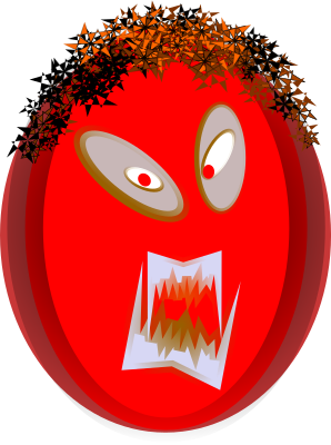 Drawing of a menacing face with red eyes and sharp teeth.