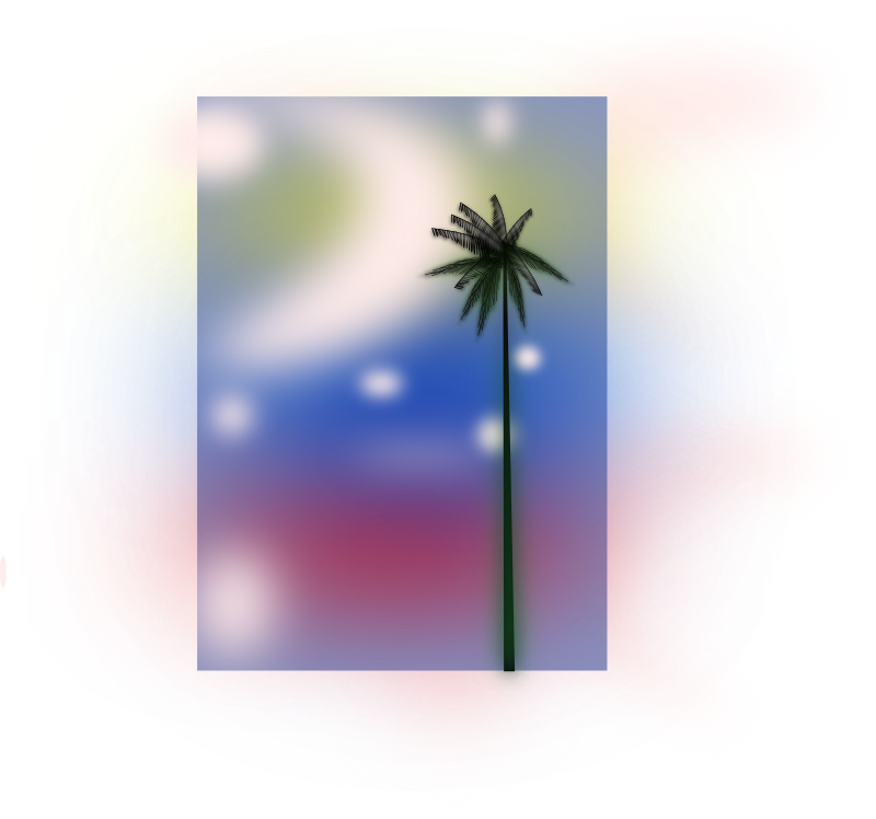 A beach scene with a palm tree and trippy sky