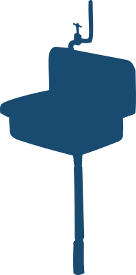 Silhouette of a sink with faucet and sewer pipe.