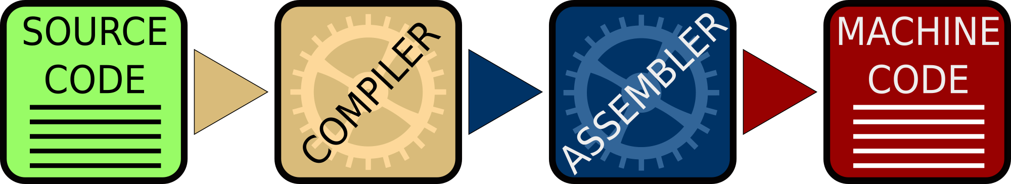 Illustrates the path of software creation from source code to machine code.