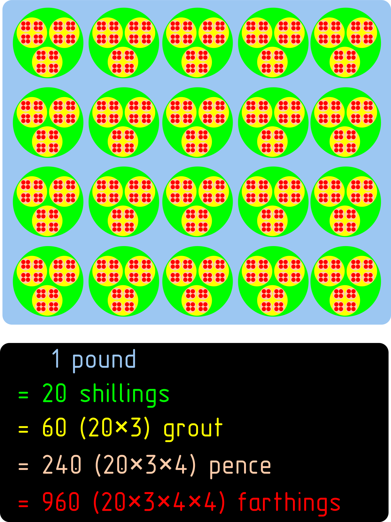 = 960 (20 × 3 × 4 × 4) farthings
