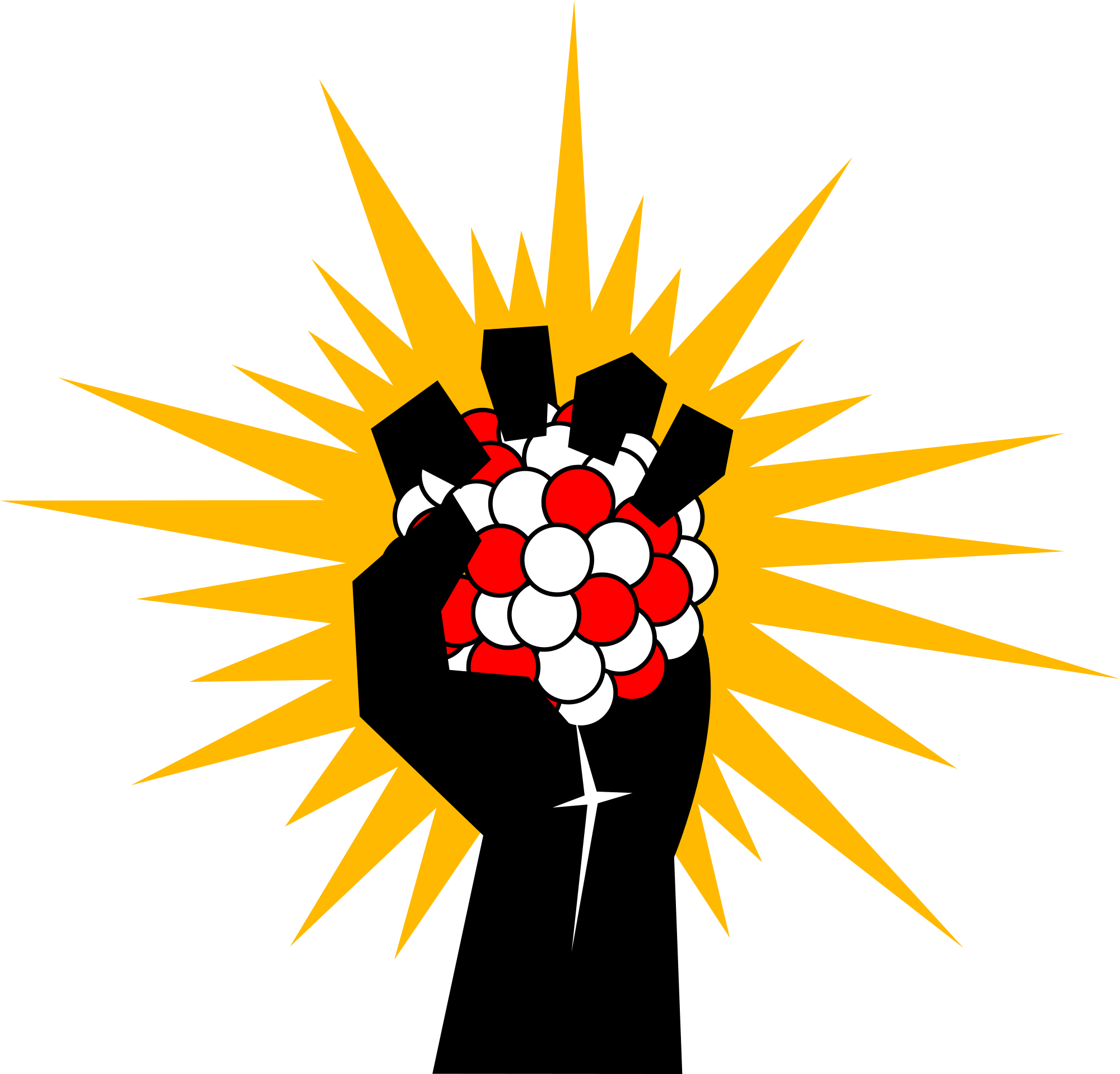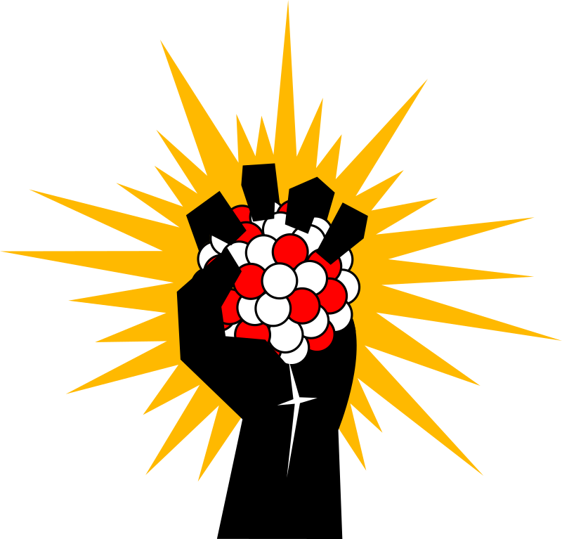 A fist clenched on a nucleus of uranium, with energy radiating from it. A metaphor for the human achievement of releasing nuclear energy.