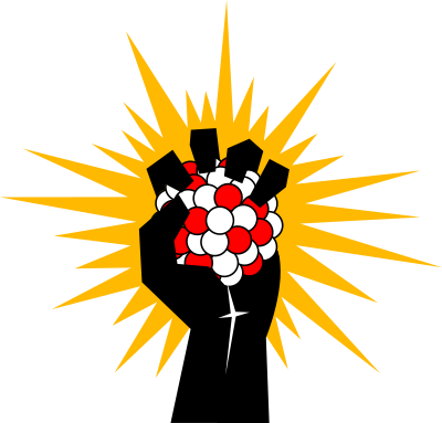 A fist clenched on a nucleus of uranium, with energy radiating from it. A metaphor for the human achievement of releasing nuclear energy.