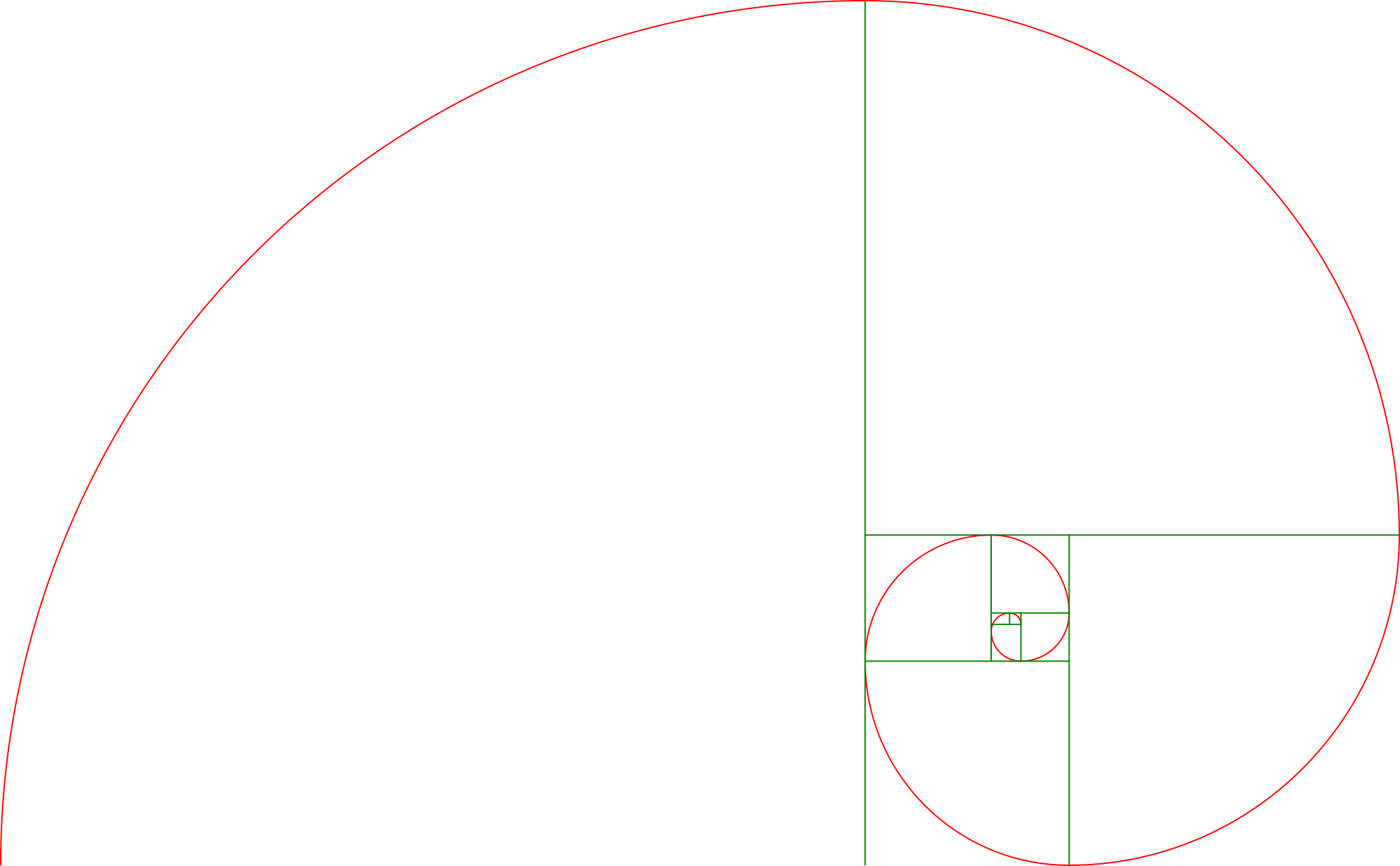 Golden spiral and ratioboxes in pure svg format. Use quarter-circles method.