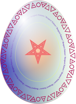 This is a neo-pagan decorated egg. The center shows an inverted pentacle, which means winter. The surrounded text says, RESPECT NATURE !