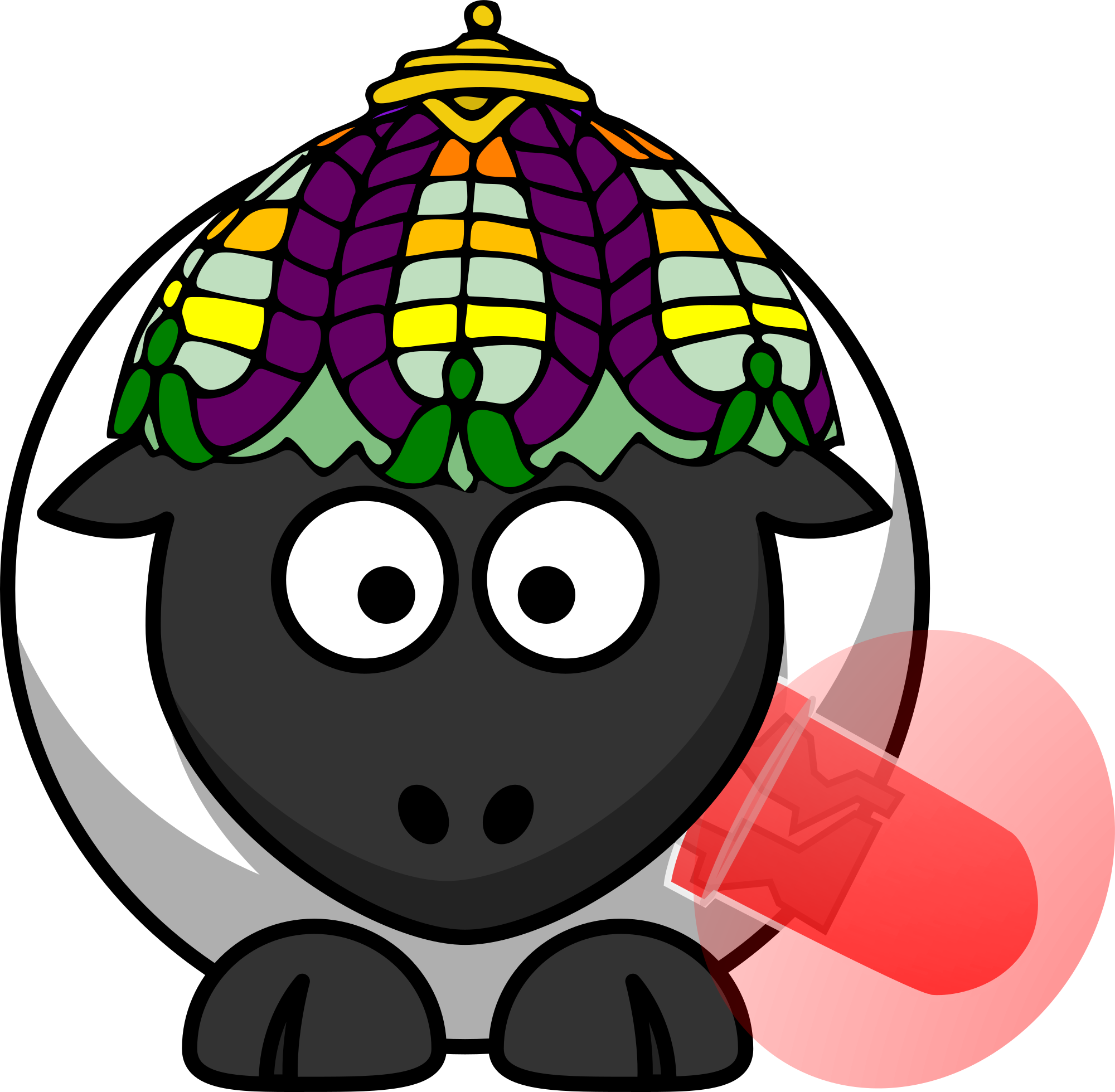 Sheep with lampshade on the head and LED in the mouth