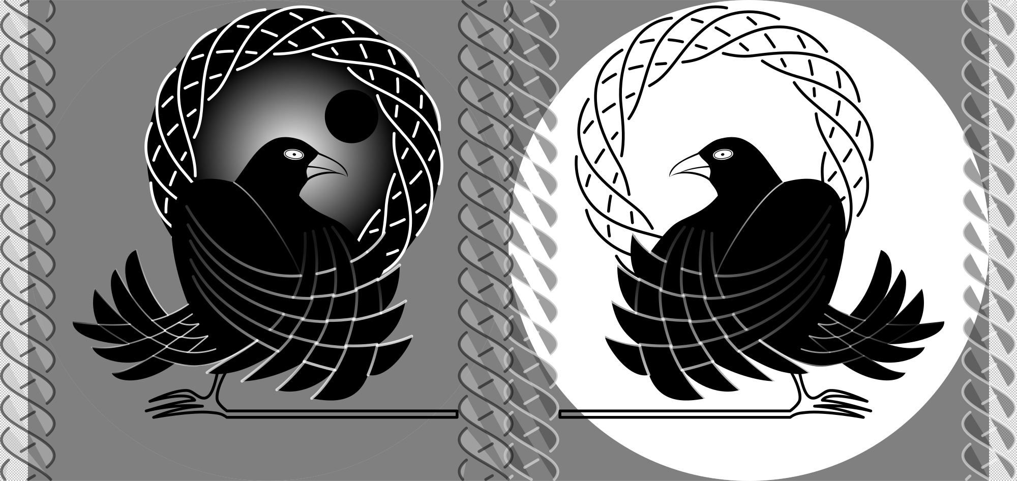 Darstellung beider Rabenvögel Hugin (denken) und Munin (denken an).