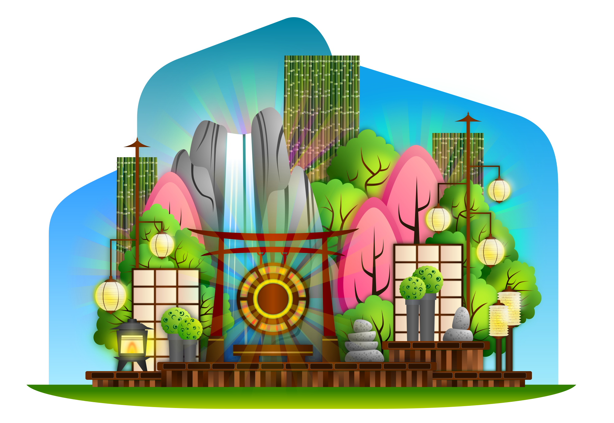 - Asian Bamboo Bush Bushes Colorful drummyfish-awesome Foliage Garden Lantern Mountain Rock Stone Tree Trees Waterfall Zen Zen Garden Japan China Asia