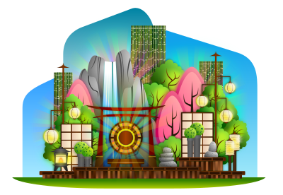 A zen garden with assorted Oriental decorations.