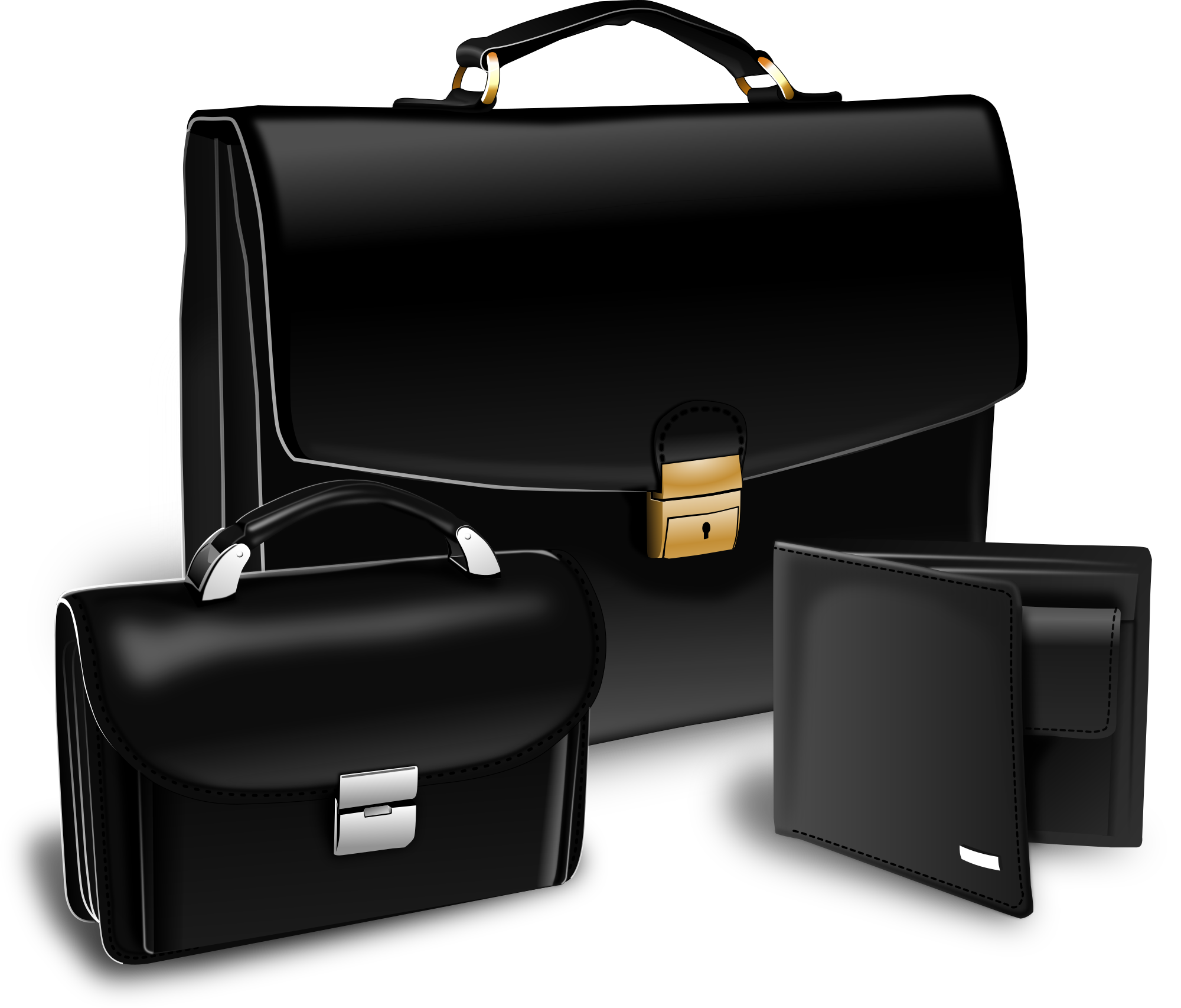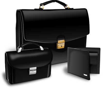 Black suitcase, purse and handy.