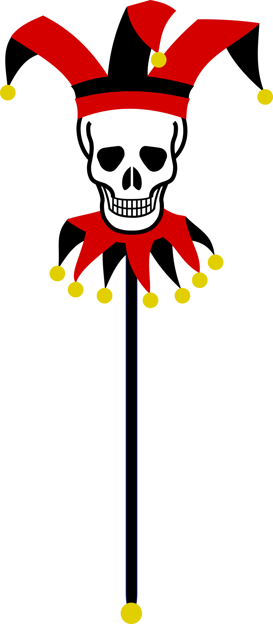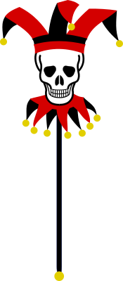 A simple black and red marotte with a skull for a face with gold bells