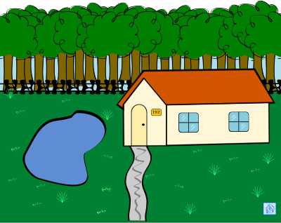 A 2D drawing of a house in its environment.