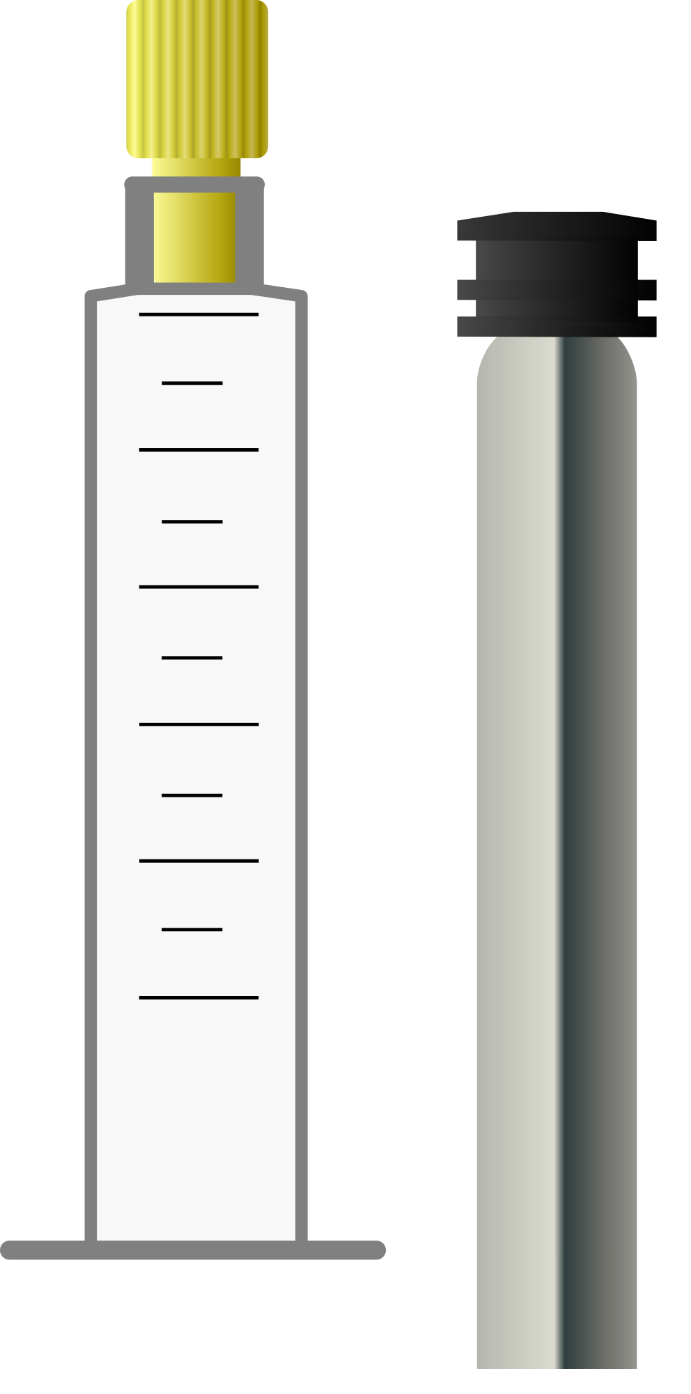 Gasdichte 10 ml Spritze mit LuerLock-Anschluss und gelbem Verschluss-Stopfen. Der Stempel ist in einer anderen Ebene und kann getrennt von der Spritze verschoben werden. Auch der Verschluss ist als Gruppierung beweglich und kann entfernt werden.