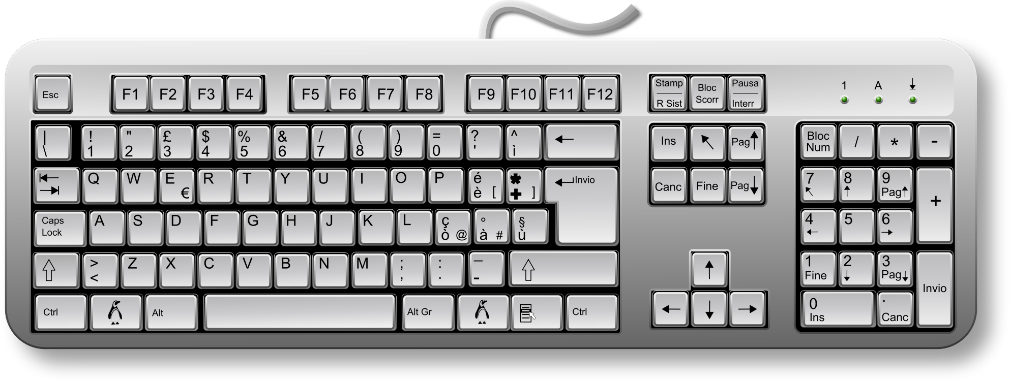 A remix of Fabiovaleggia's Italian Keyboard clip art. Added some gradients. I also added a penguin for the Super Key. Thanks go to Tandiljuan for his penguin clip art found at http://openclipart.org/detail/3690/ping%EF%BF%BDino-2.0-by-tandiljuan