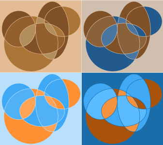 A series of four compositions in orange blue and brown using ovals and circles