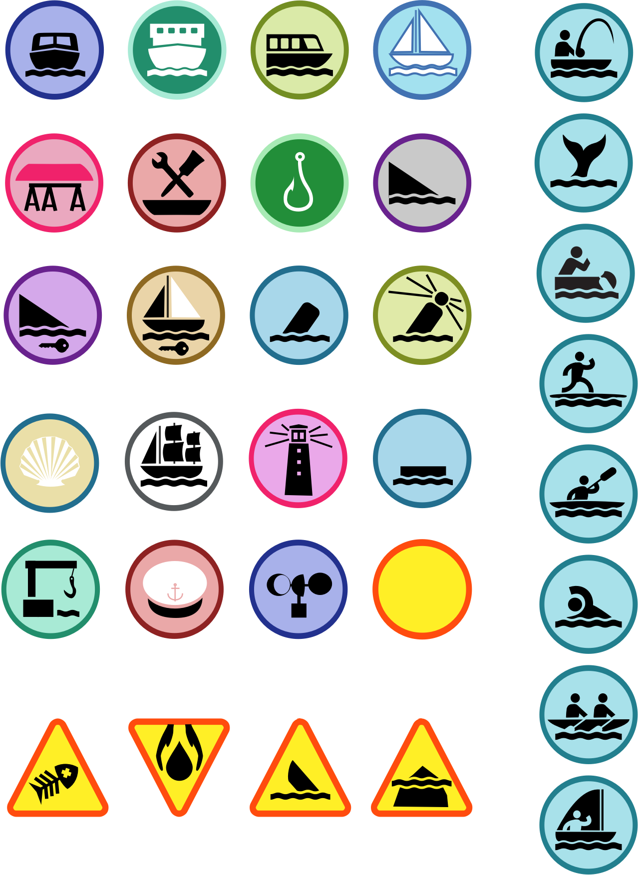 A set of badges for decorating maps of harbor areas to make it easier to find information relevant to boaters.