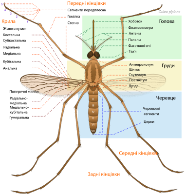 A generic mosquito scheme describing its anatomy, with labels in Ukrainian. Great work done by LadyofHats, taken from Wikepedia: http://en.wikipedia.org/wiki/File:Culex_pipiens_diagram_en.svg