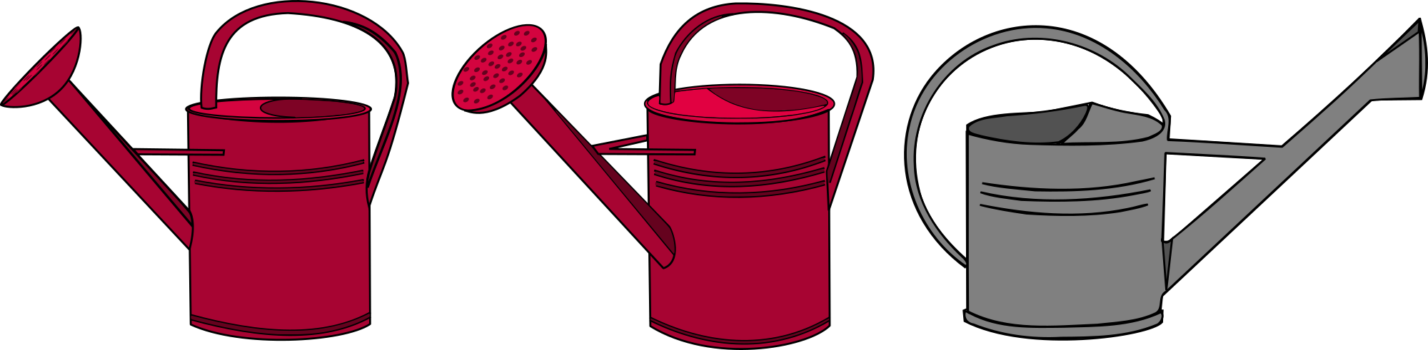 3 watering cans, two red and a grey one.