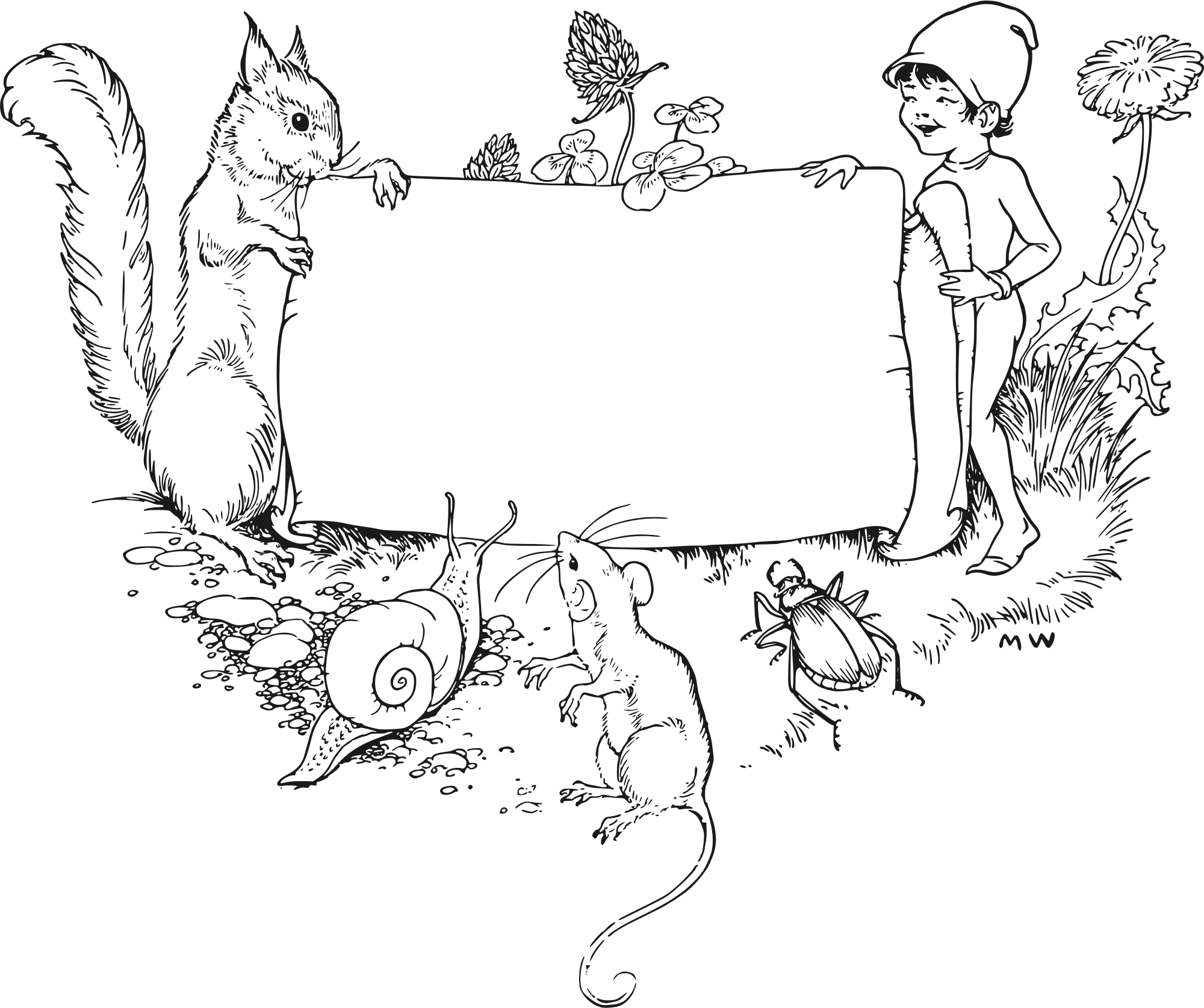 A squirrel and an elf holding a scroll traced from http://thegraphicsfairy.com/vintage-clip-art-childrens-bookplate-squirrel-elf/