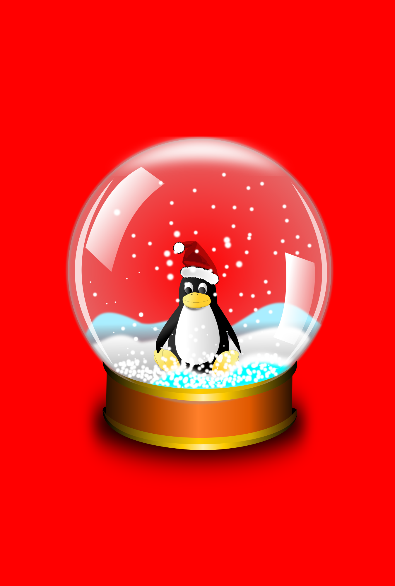 A large snow globe, with tux inside on a red background