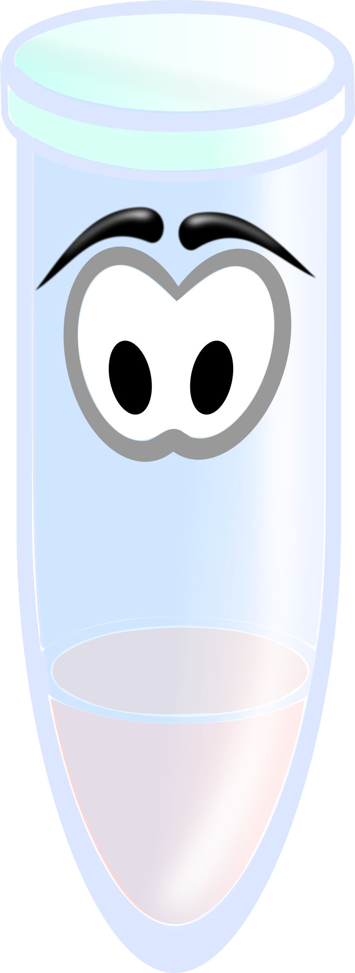 A small reaction tube with some frowning eyes filled with a pink liquid.