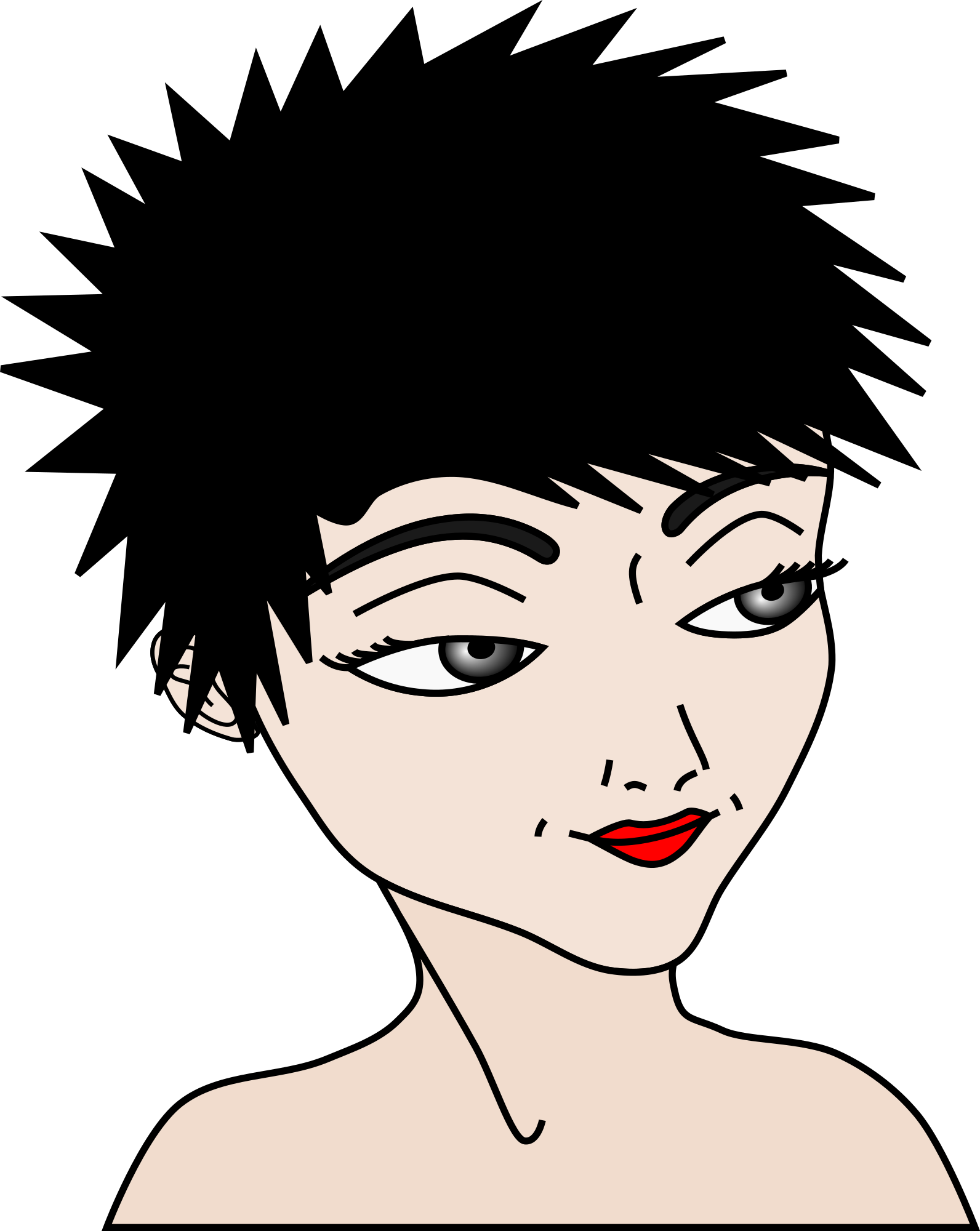Female face, red lips, black, short hair. 3/4 frontal