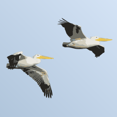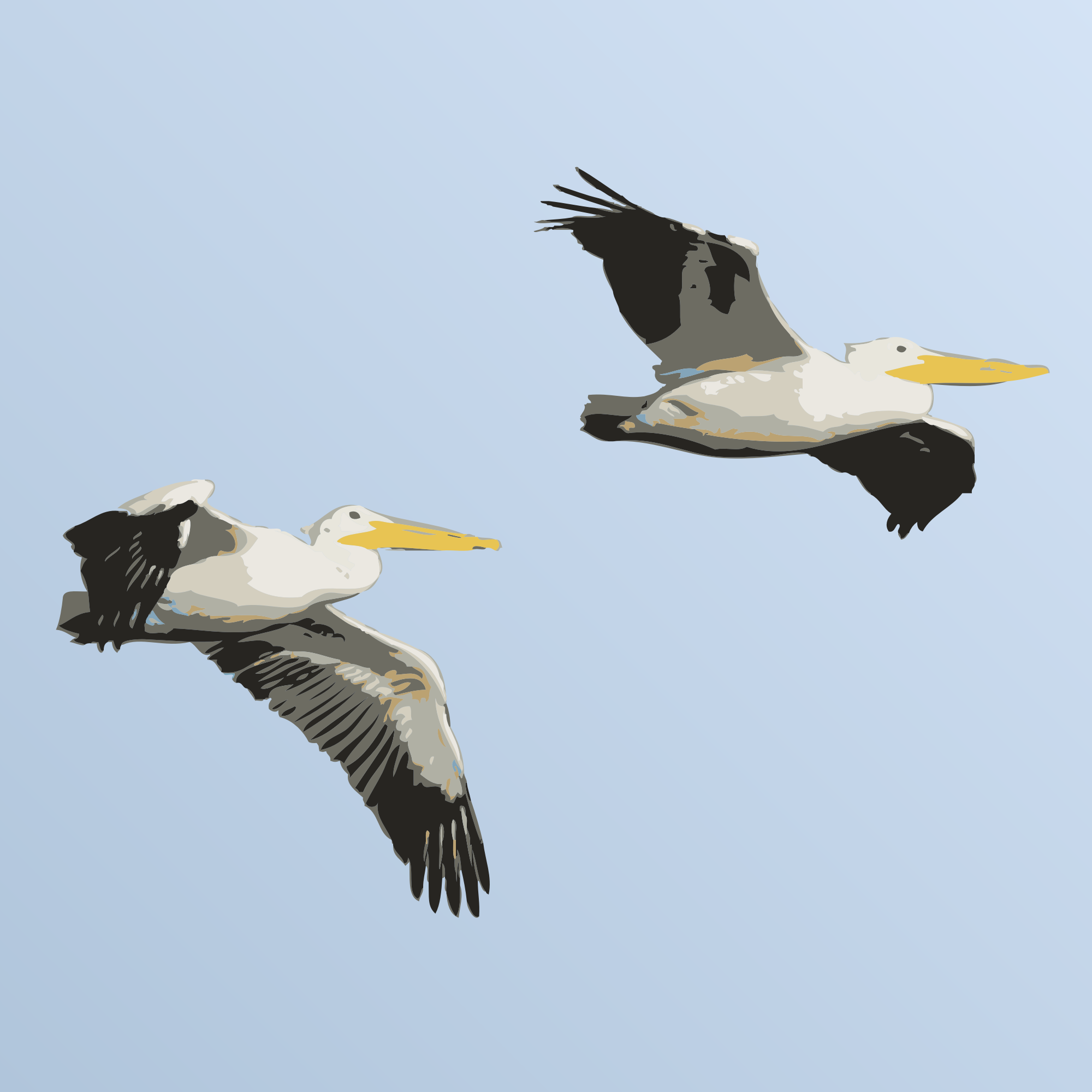 Simple image of two pelicans in flight against a field of blue.