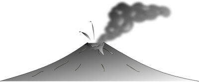 A greyish smoking cartoon volcano with some projectiles