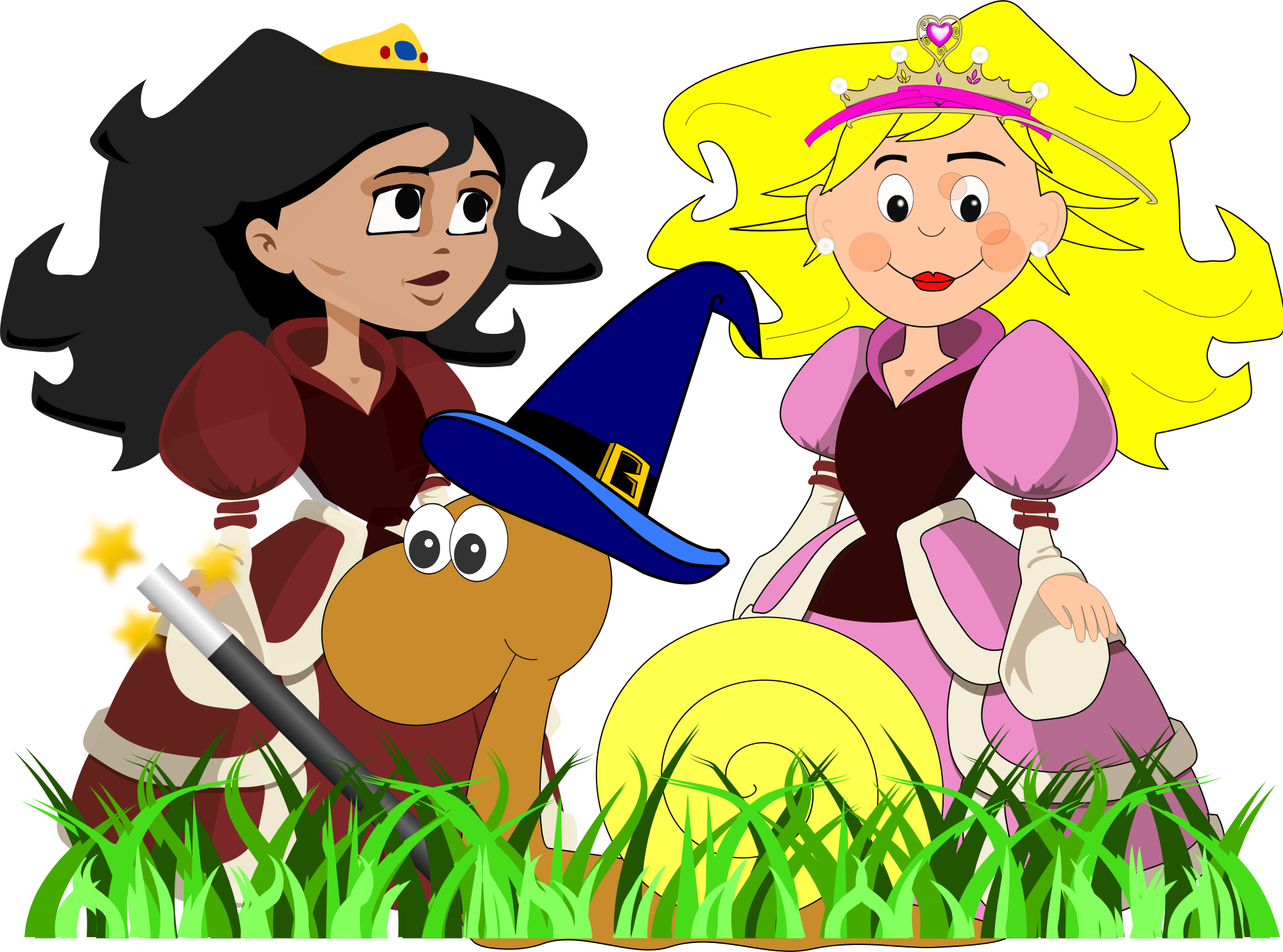 Two princesses in fairy tale illustration style, with a slug and grass in front.
