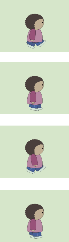 The four frames can be converted to an animated GIF. Goes with the tutorial at http://foofurple.org/2014/02/22/walking-making-a-simple-animation-with-inkscape-and-the-gimp/.