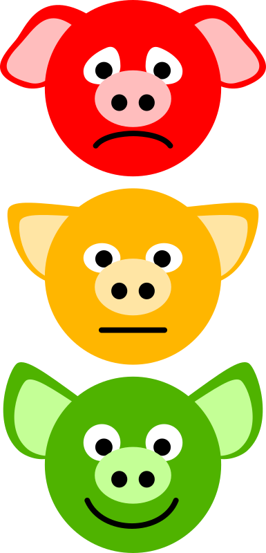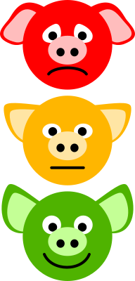 Simple pig head icons: sad, serious and happy, colored like traffic lights.