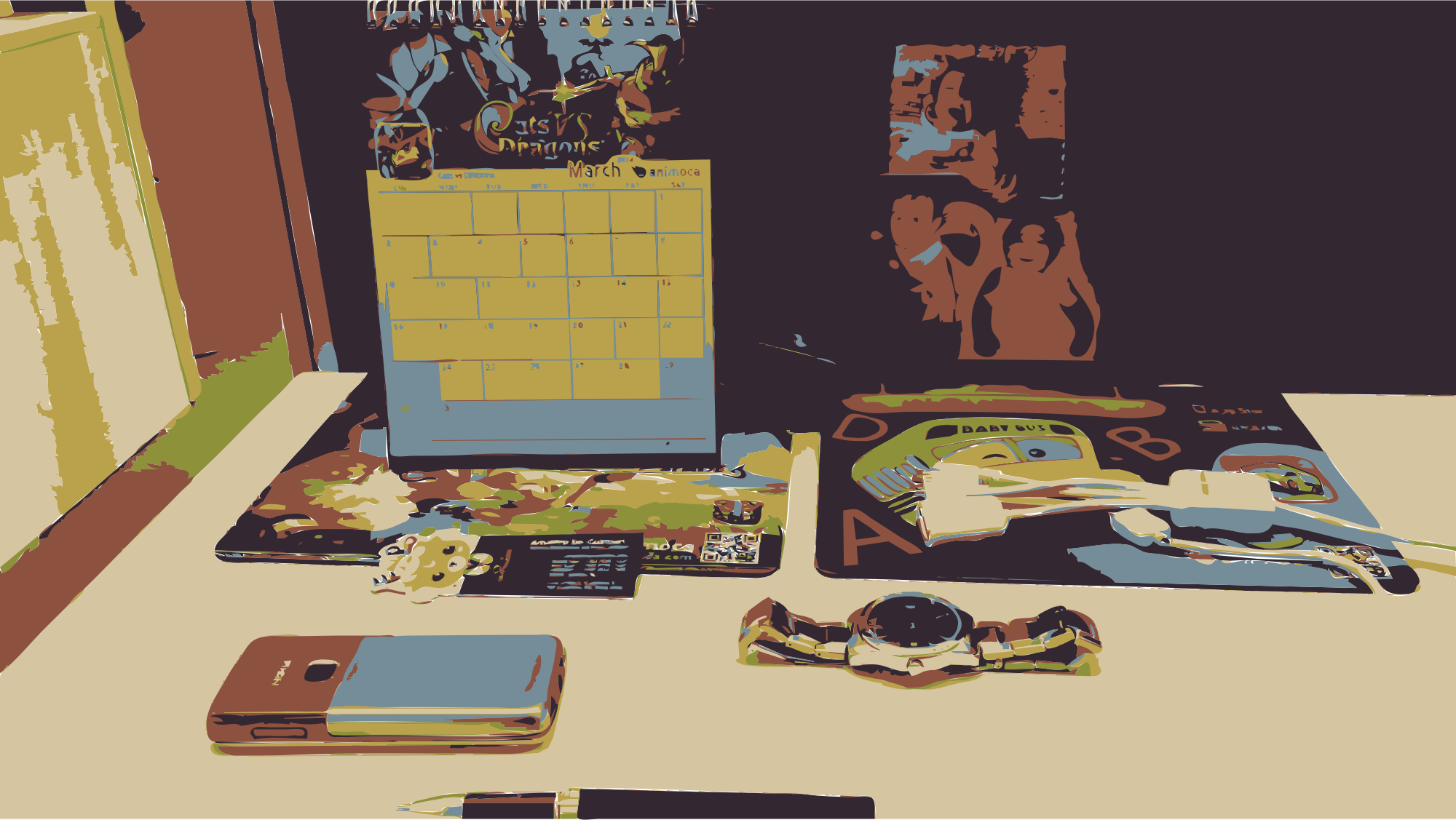 A desk with for example a phone, a calendar and a watch.