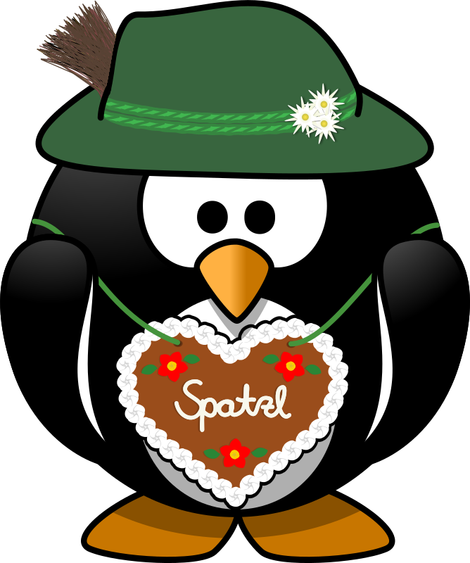 This little Bavarian penguin has already adapted to local clothing traditions, wearing a traditional hat with edelweiss (the flowers) and gamsbart (the hair of chamois), and showing his love for his bride with a gingerbread heart. "Spatzl" is a pet name, meaning 'little sparrow'.
