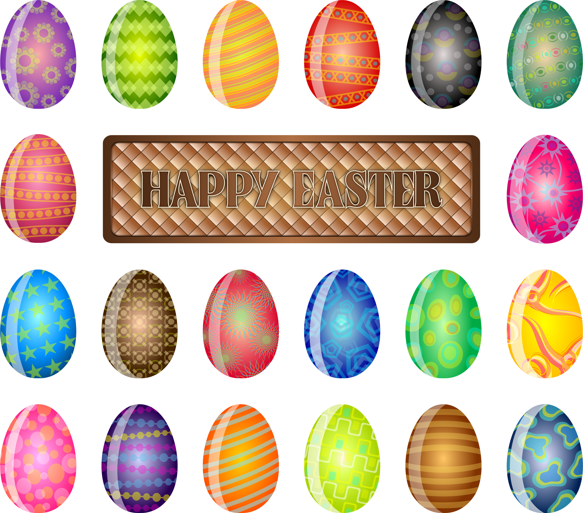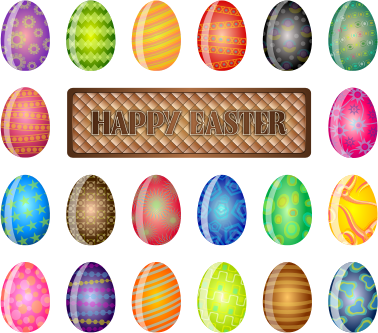 A friendly sign wishing everyone a Happy Easter surrounded by many beautifully decorated and colored Easter Eggs.