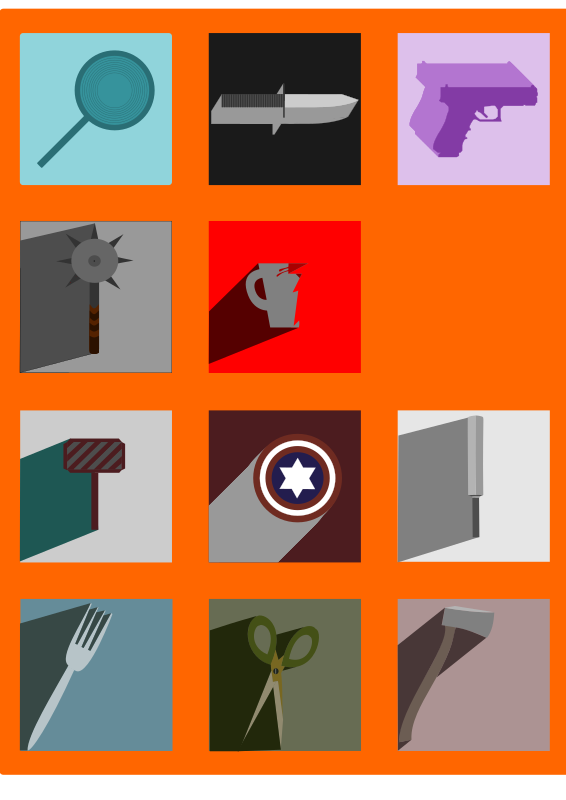 - axe broken mug cricket bat fork frying pan gun hammer knife lightsaber long shadow mace scissors shadow shield weapon weapons