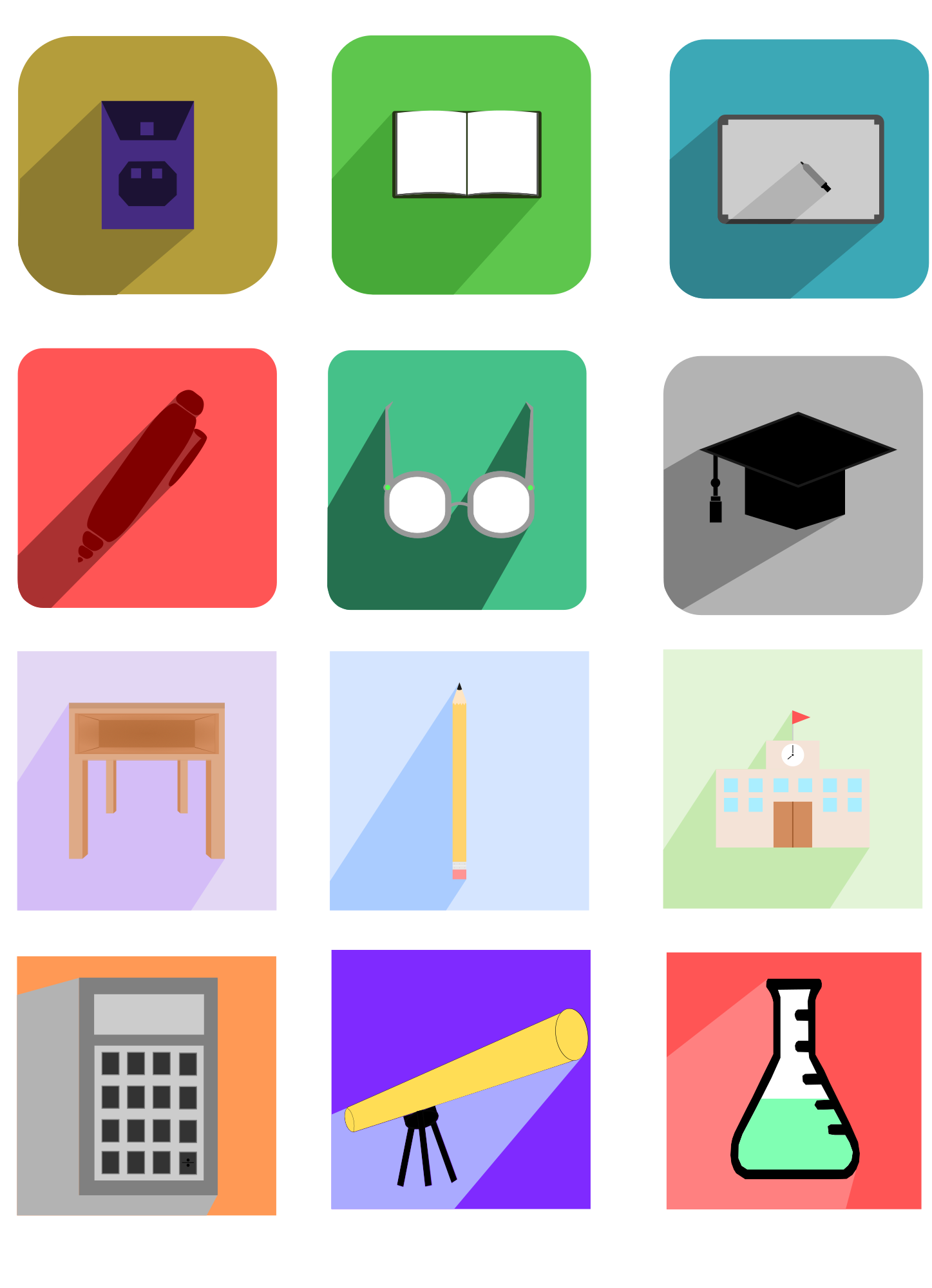A collection of long shadow flat design icons, centered around a theme of education. Enjoy!!