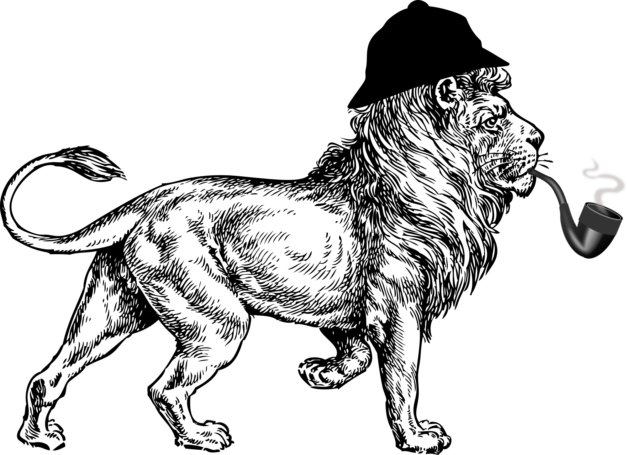 Lion wearing a deerstalker hat and smoking a pipe.