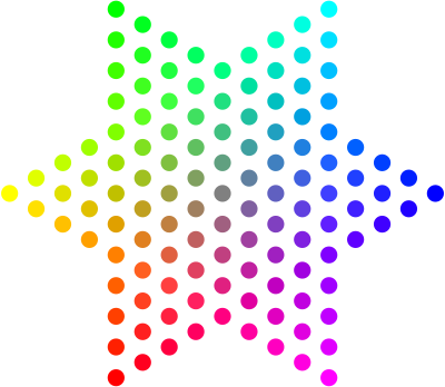 Grid of dots arranged in a hexagram to demonstrate RGB (red-green-blue) color mixing