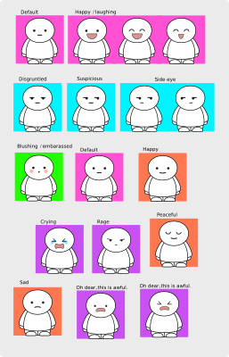 Simple interchangable faces for cartoon characters. A lot of the expressions were built from qubodup's smilies.