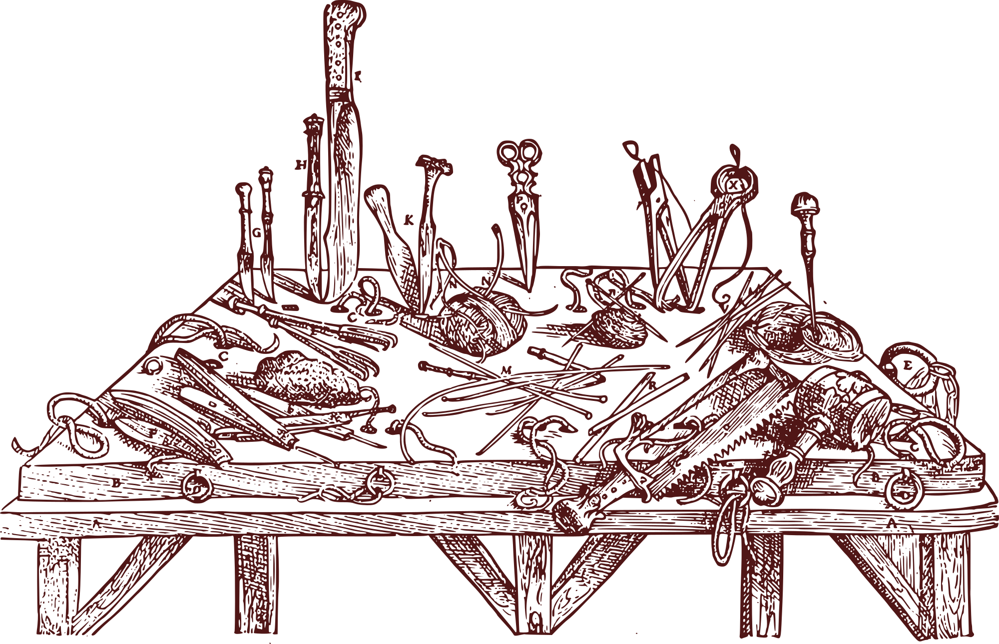 - anatomist anatomy Architecture of an Artist craft dissect dissection dissector forceps hammer knife medicine needle pincers saw scalpel scissors table thread tongs tool tools work bench