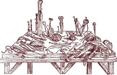 From Andreas Vesalius's book about dissection technique: A workbench with all the tools an anatomist might ever need to dissect a dead body.