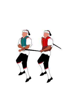 The men are organized into a village military unit with a captain and flag-bearer, and each soldier holds a single long sword. Dialog precedes their performances, where the captain of his army asks permission from the head of the village to perform their "ples od boja" (war dance). The captain leads his soldiers into synchronized and highly coordinated formations where each soldier holds the tip of his neighbor's sword to form a single linked group.