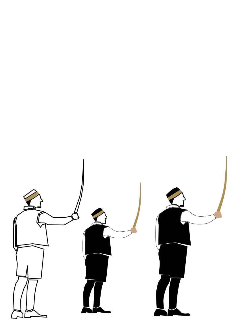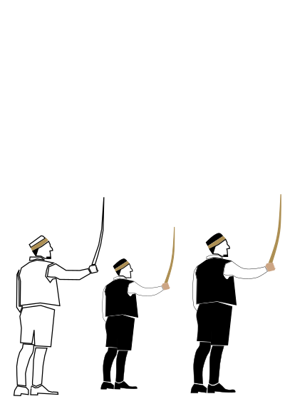 The men are organized into a village military unit with a captain and flag-bearer, and each soldier holds a single long sword. Dialog precedes their performances, where the captain of his army asks permission from the head of the village to perform their "ples od boja" (war dance). The captain leads his soldiers into synchronized and highly coordinated formations where each soldier holds the tip of his neighbor's sword to form a single linked group.