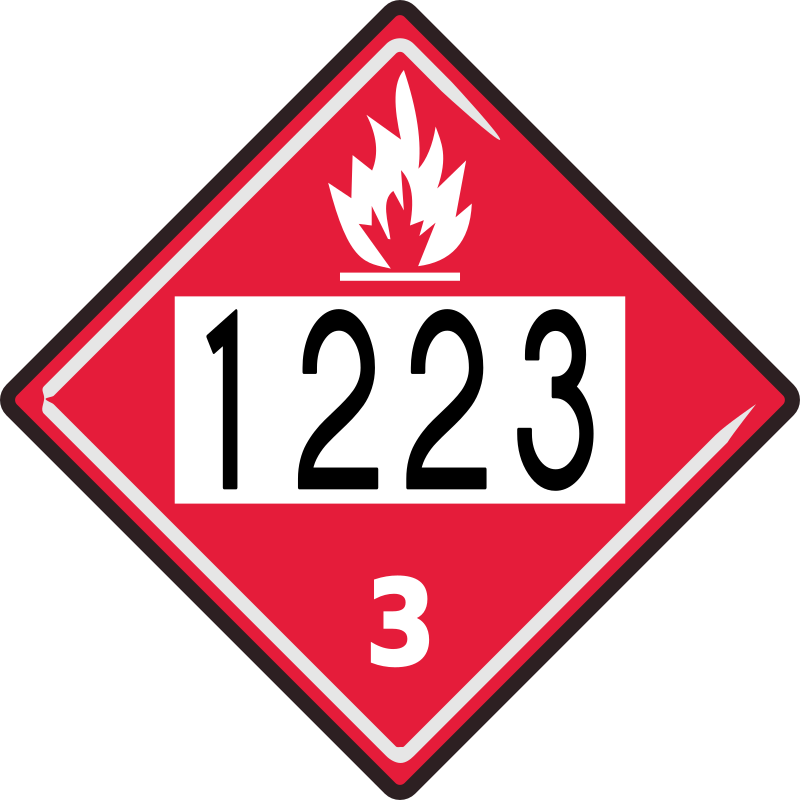 Truck sign warning that the contents of the vehicle are flammable. Showing Kerosene hazard "hazmat" number.