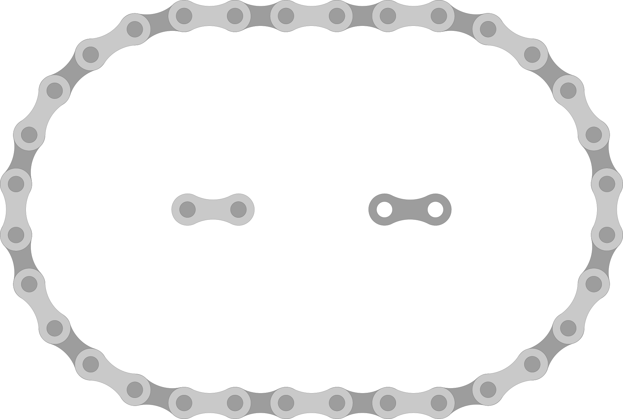Chain links and small length of chain of the type typically found on bicycles. Drawn up from the ANSI 40 chain size, dictating the roller and pin diameters and pitch.